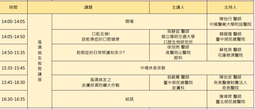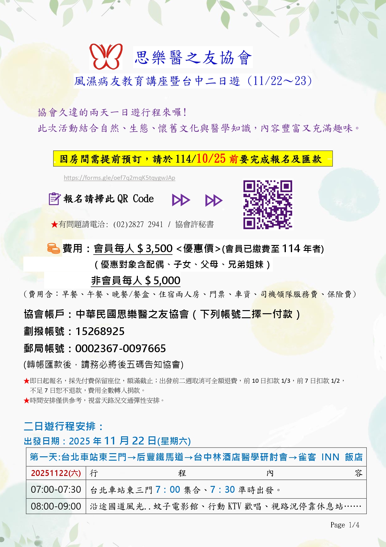 2025-11-22 風濕病友教育講座暨台中二日遊 報名方式: 填寫Google表單報名連結 =>https://forms.gle/4zsoYEzvdWVCKrFj9★只想11/22自行前往風濕病友教育講座者, 報名請電洽協會: (02)2827 2941 / 許秘書 ♦ 講座流程及地點如下 : 台中林酒店 3樓環球廳 地址:台中市西屯區朝富路99號 回上一頁