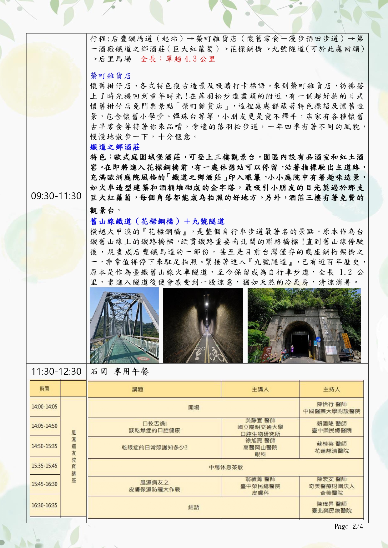 2025-11-22 風濕病友教育講座暨台中二日遊 報名方式: 填寫Google表單報名連結 =>https://forms.gle/4zsoYEzvdWVCKrFj9★只想11/22自行前往風濕病友教育講座者, 報名請電洽協會: (02)2827 2941 / 許秘書 ♦ 講座流程及地點如下 : 台中林酒店 3樓環球廳 地址:台中市西屯區朝富路99號 回上一頁
